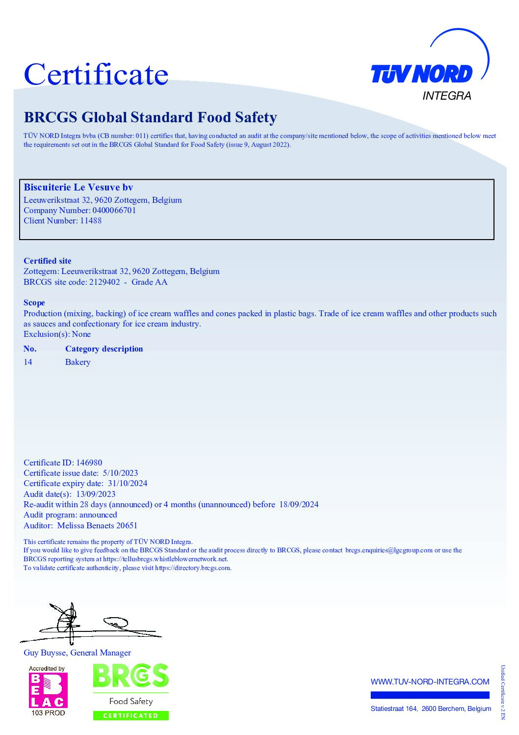 Onze koekjes zijn niet alleen lekker maar ook in een veilige omgeving gemaakt. We zijn fier te kunnen zeggen dat we beschikken over een BRCGS Global Standard Food Safety AA-certificaat. Elke dag opnieuw werken we onder het toeziend oog van onze in-huis kwaliteitsverantwoordelijke Eva Eeman.